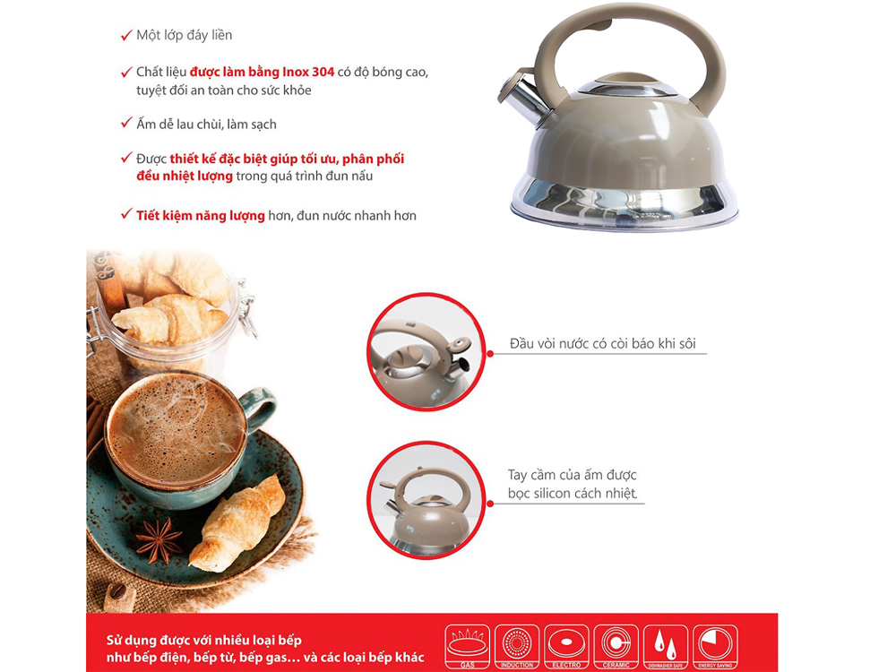 Đặc biệt vòi ấm trang bị còi báo khi nước sôi giúp người dùng chủ động trong việc đun nước. Ấm đun nước có thiết kế nắp đậy ở vòi ấm đảm bảo kín hơi và vệ sinh trong quá trình đun nước.