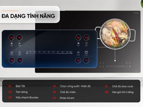 Đặc biệt là mỗi vùng nấu được trang bị chức năng Booster gia nhiệt nhanh, khi kích hoạt sẽ nâng mức công suất vùng nấu lên mức cực đại là 2200W, giúp nấu nhanh hơn, tiết kiệm thời gian.