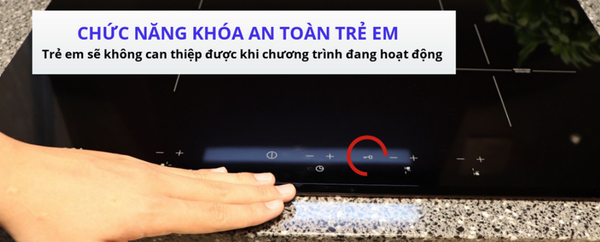 Yên tâm hơn với chức năng khóa an toàn trẻ em: Bếp được trang bị khóa an toàn cho trẻ em độc lập dành riêng cho từng vùng nấu. Chức năng này giúp ngăn ngừa trẻ nhỏ có vô tình chạm tay vào bếp thì cũng không điều khiển được. Khi bạn muốn điều khiển lại bếp thì chỉ việc mở khóa trên bảng điều khiển.