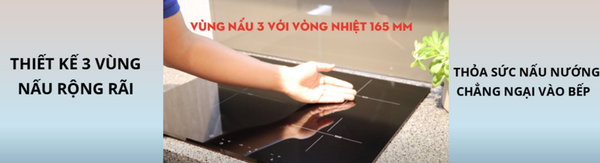 Khu vực nấu bếp bao gồm 3 phần, đan chéo: Vùng nấu 1: vòng nhiệt 270 mm, vùng nấu 2: vòng nhiệt 240 mm, vùng nấu 3: vòng nhiệt 165 mm
