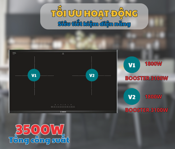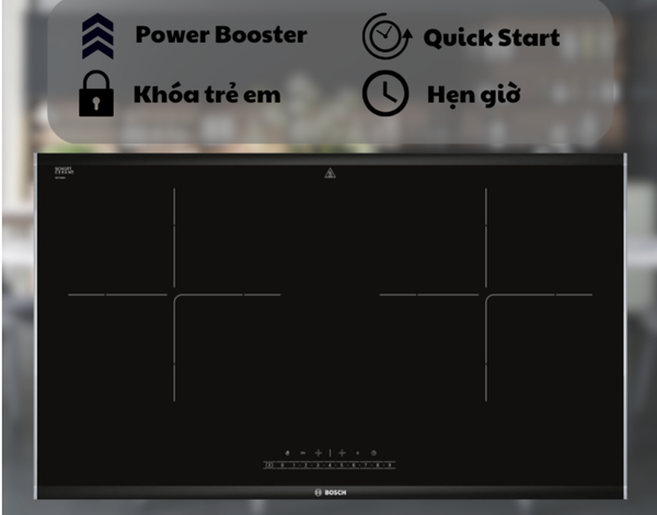 - Bếp từ Bosch có tổng công suất 2800W, trang bị tính năng Booster làm nóng nhanh.