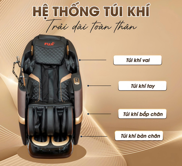 Ghế massage Fuji FJ-988 được trang bị hệ thống túi khí massage toàn thân phân bố đều ở vai, tay, hông, bắp chân và bàn chân. Các túi khí hoạt động co giãn nhịp nhàng giúp kích thích lưu thông máu và giảm đau cơ nhanh chóng. Người dùng có thể tùy chỉnh nhiều cường độ áp lực để phù hợp với thể trạng, mang lại cảm giác thư giãn êm ái toàn thân.