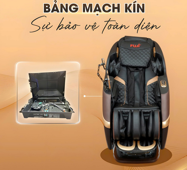 Ghế massage Fuji FJ-988 được trang bị bảng mạch kín giúp ngăn bụi, ẩm, chuột hay côn trùng xâm nhập, đảm bảo an toàn tuyệt đối cho hệ thống điện tử bên trong. Nhờ đó mà sản phẩm hoạt động ổn định và bền bỉ theo thời gian.