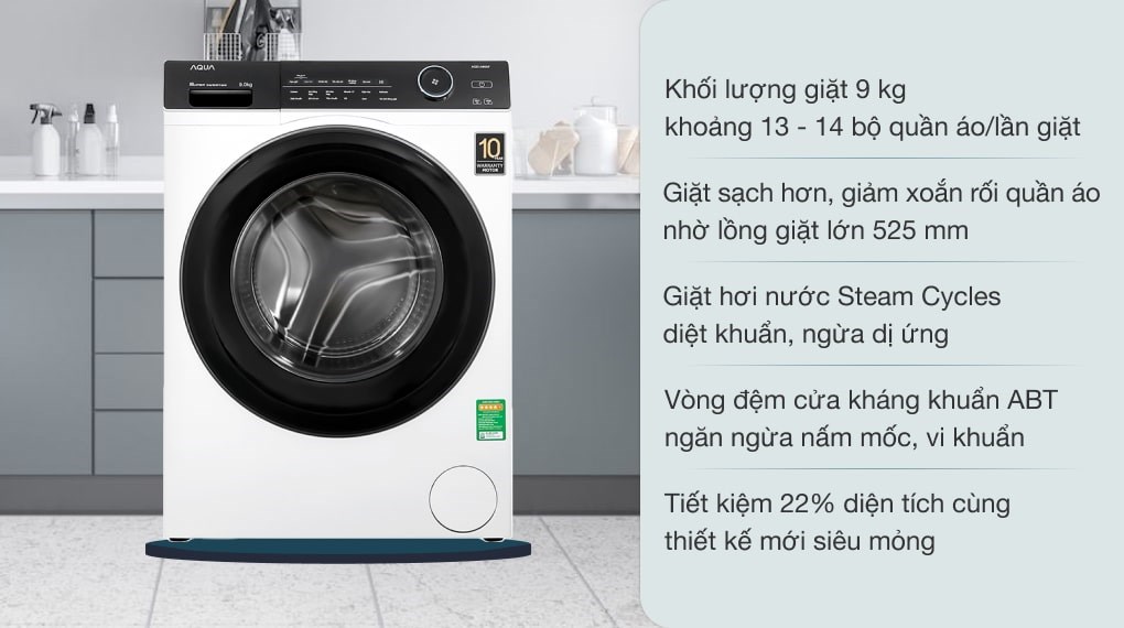Máy giặt Aqua Inverter 9.0 KG AQD-A900F W là lựa chọn phù hợp cho những gia đình từ 3 - 5 thành viên. Máy giặt có khả năng tiết kiệm điện hiệu quả kèm với khả năng loại bỏ các tác nhân gây dị ứng bám trên quần áo một cách tối ưu, rất phù hợp cho những gia đình có trẻ nhỏ hoặc người có làn da nhạy cảm.