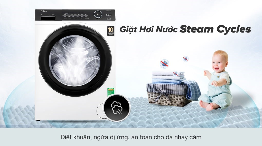 Máy giặt Aqua này còn sở hữu công nghệ giặt hơi nước, giúp cho quần áo được diệt khuẩn tối ưu cũng như loại bỏ hầu hết những tác nhân gây dị ứng còn bám trên đồ và giảm thiểu mức độ nhăn của quần áo sau khi giặt.