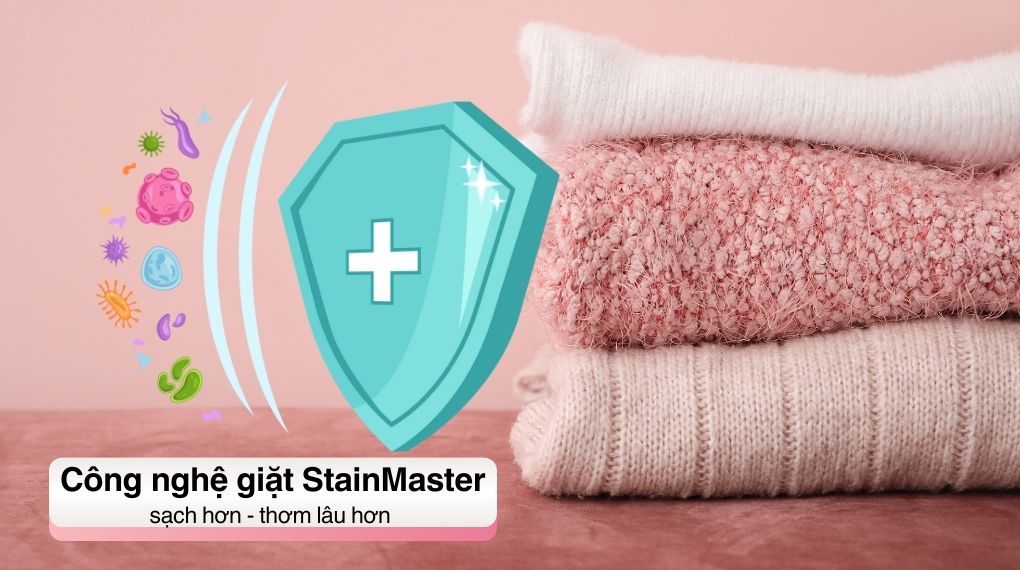 - Công nghệ StainMaster và chương trình giặt lưu hương giúp loại bỏ các vết bẩn cứng đầu, lưu giữ hương thơm bền lâu ngay cả sau một ngày dài làm việc.