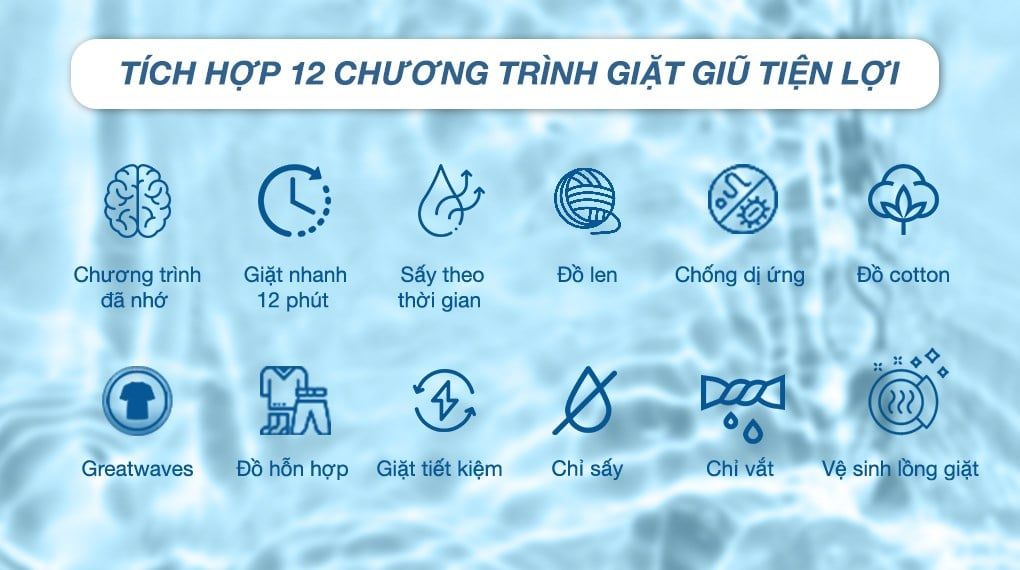 - Công nghệ Greatwaves: bảo vệ đồ cực tốt với chương trình giặt nước lạnh. Độ phai màu quần áo giảm đến 39%. Tiết kiệm tới 67% năng lượng mà vẫn đảm bảo khả năng giặt sạch tối ưu.