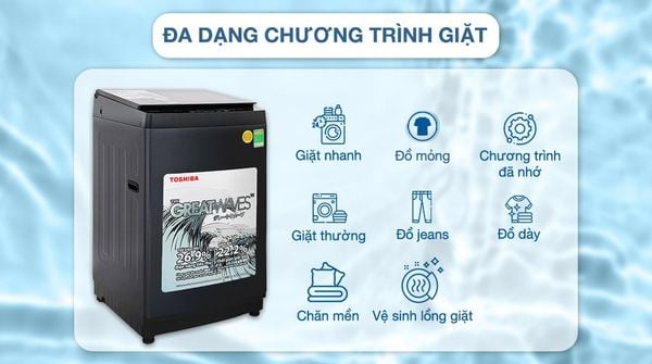 - Công nghệ Greatwaves: với sự kết hợp 3 luồng nước cùng các tia nước tạo ra từ lỗ phun của máy giặt Toshiba, thiết bị kiến tạo luồng nước siêu mạnh giúp phân tách quần áo, chống xoắn rối, loại bỏ vết bẩn, cặn xà phòng, giúp giặt sạch và bảo vệ chất liệu vải.