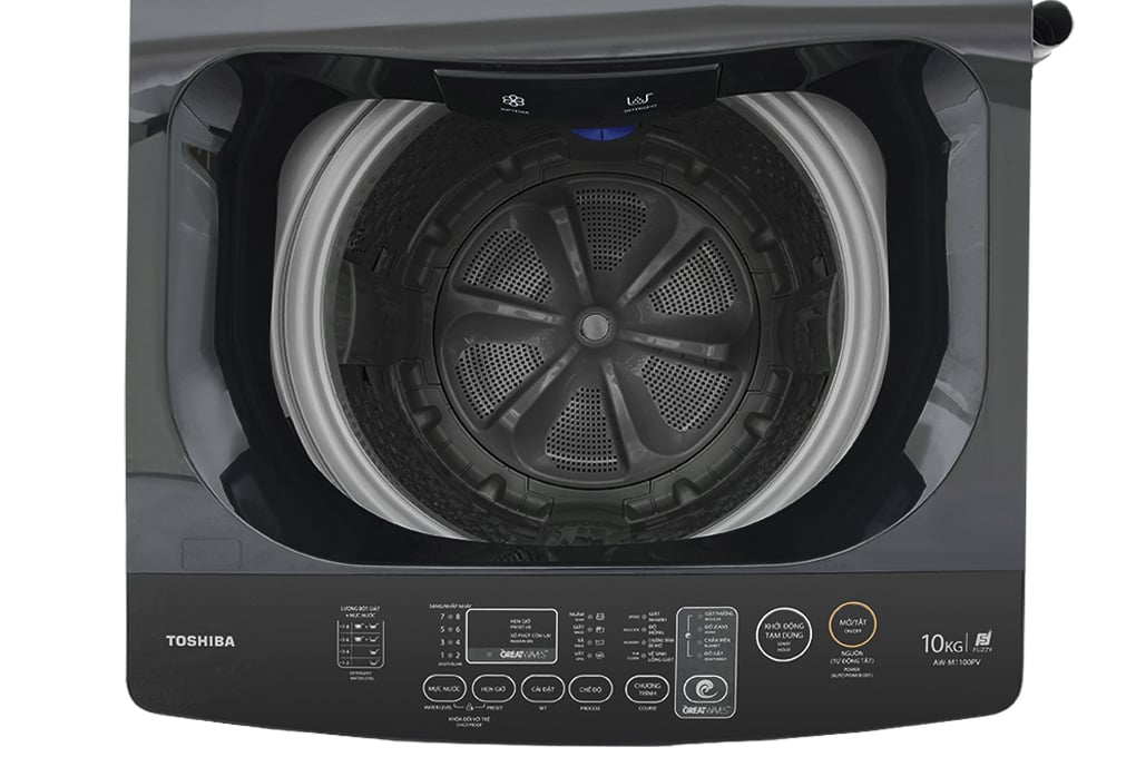 Máy giặt Toshiba 10 kg AW-M1100PV(MK) giặt quần áo sạch sẽ, chống xoắn rối với công nghệ giặt siêu sóng Greatwaves, công nghệ suy luận ảo Fuzzy Logic giúp tiết kiệm nước mà vẫn đảm bảo hiệu suất giặt, giúp cho thiết bị chạy êm ái, giảm hao phí điện năng, giặt đồ linh hoạt với 8 chương trình giặt khác nhau.