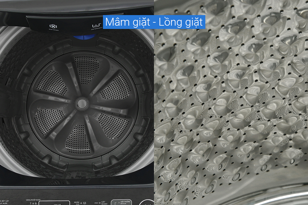 - Lồng giặt ngôi sao pha lê: thiết kế gờ nổi có dạng ngôi sao, các lỗ phun nước nằm rải khắp lồng giặt tạo hiệu ứng chà xát quần áo nhẹ nhàng, làm tăng hiệu suất giặt lên 5% mà không làm hư hại đến trang phục của bạn.