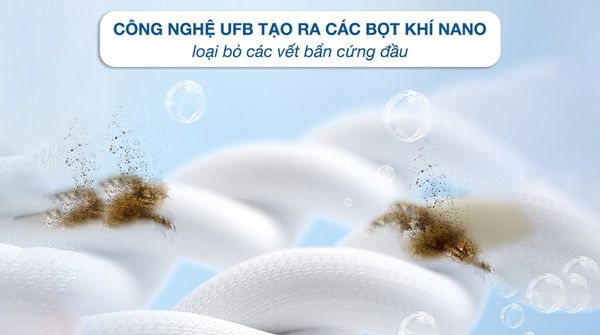 - Công nghệ UFB siêu bọt khí Nano hoạt động bằng cách tạo ra các bọt khí với kích thước siêu nhỏ hút các phân tử chất giặt tẩy, phân bổ đến mọi nơi trong nước giúp bột giặt thẩm thấu vào từng sợi vải, đánh bay những vết bẩn cứng đầu, đồng thời hỗ trợ nước xả vải phát huy công dụng tối đa, quần áo thơm tho lâu hơn.