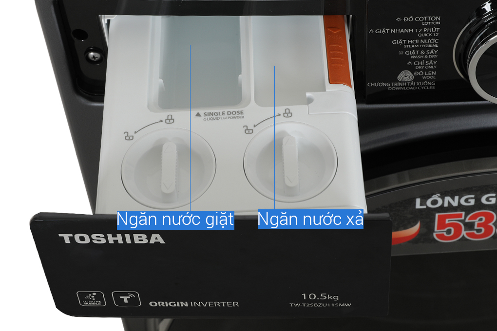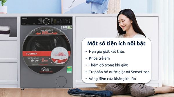 - Máy giặt Toshiba có khối lượng giặt 10.5 kg, phù hợp với gia đình trên 7 thành viên hoặc gia đình ít thành viên hơn nhưng nhu cầu giặt giũ hàng ngày cao.