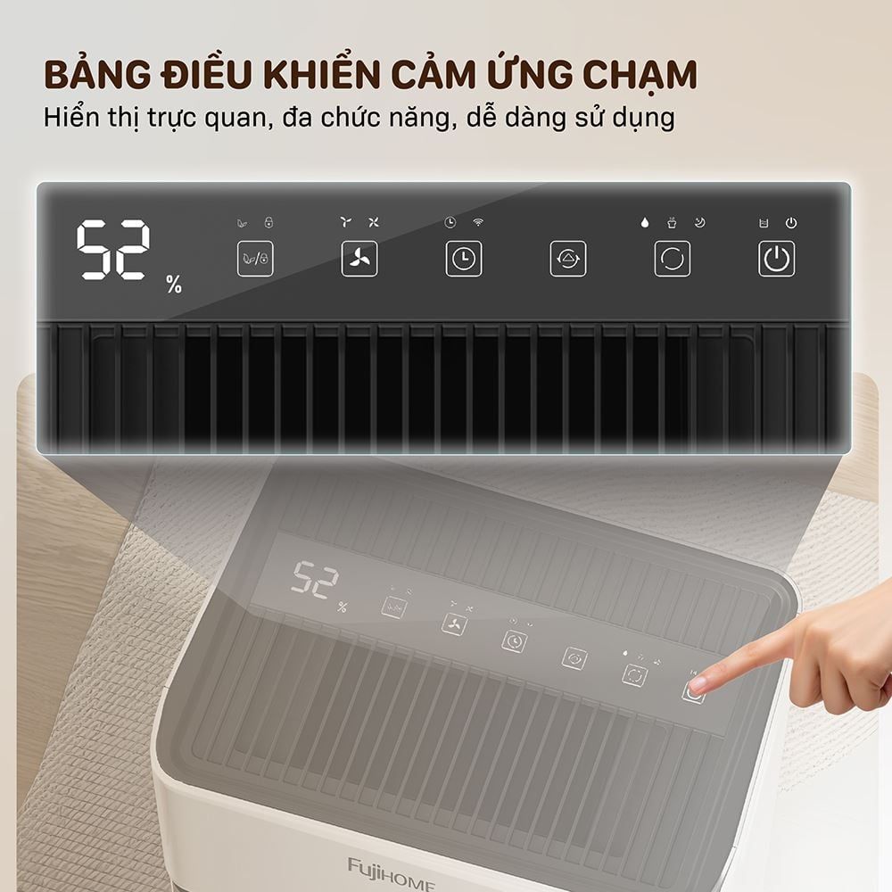 Bảng điều khiển của FUJIHOME DH07 được thiết kế đơn giản, dễ sử dụng với cảm ứng chạm nhạy bén, hình ảnh hiển thị trực quan, đa chức năng lựa chọn. Một điểm cộng lớn là máy hút ẩm có cảm biến độ ẩm thực tế, hiển thị qua 3 chế độ màu sắc khác nhau, giúp bạn dễ dàng nắm bắt tình trạng độ ẩm trong phòng: Màu xanh dương (độ ẩm ≤45%), Màu xanh lá (độ ẩm 45-65%), và Màu đỏ (độ ẩm >65%). Điều này giúp bạn điều chỉnh máy một cách chính xác và hiệu quả hơn.
