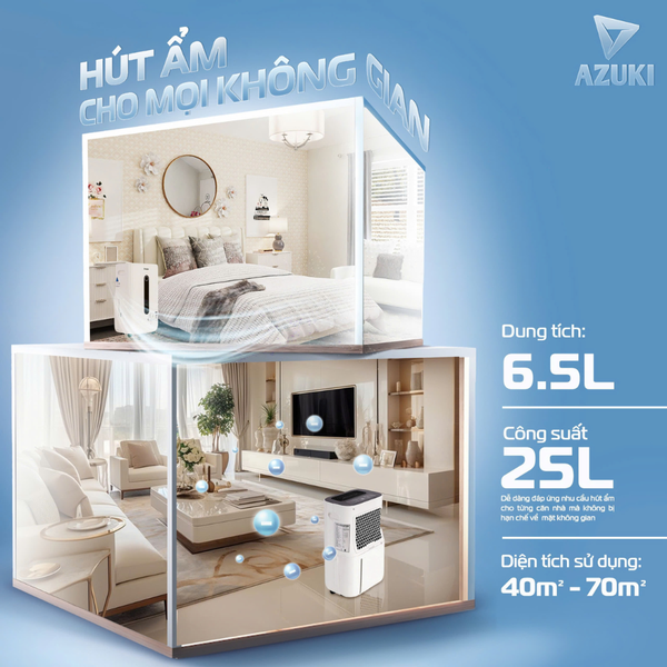 AZUKI GALAXY X3 sở hữu công suất hút ẩm lên đến 25 lít/ngày, kết hợp bình chứa nước lớn 6,5 lít, giúp máy hoạt động liên tục trong thời gian dài mà không cần đổ nước thường xuyên. Khả năng hút ẩm mạnh mẽ cho phép máy xử lý hiệu quả độ ẩm trong các không gian từ 40–70m², loại bỏ hơi ẩm ở mọi ngóc ngách, hạn chế tối đa tình trạng nấm mốc trên tường, sàn nhà và đồ nội thất.
