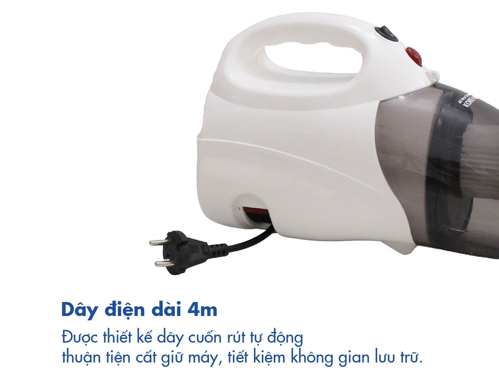Máy hút bụi cầm tay dùng nguồn điện áp 220V/50Hz, dây điện dài 4m giúp làm việc ở khoảng cách xa hiệu quả, làm việc ổn định hơn. Dây rút tự động thuận tiện cho việc bảo quản máy.
