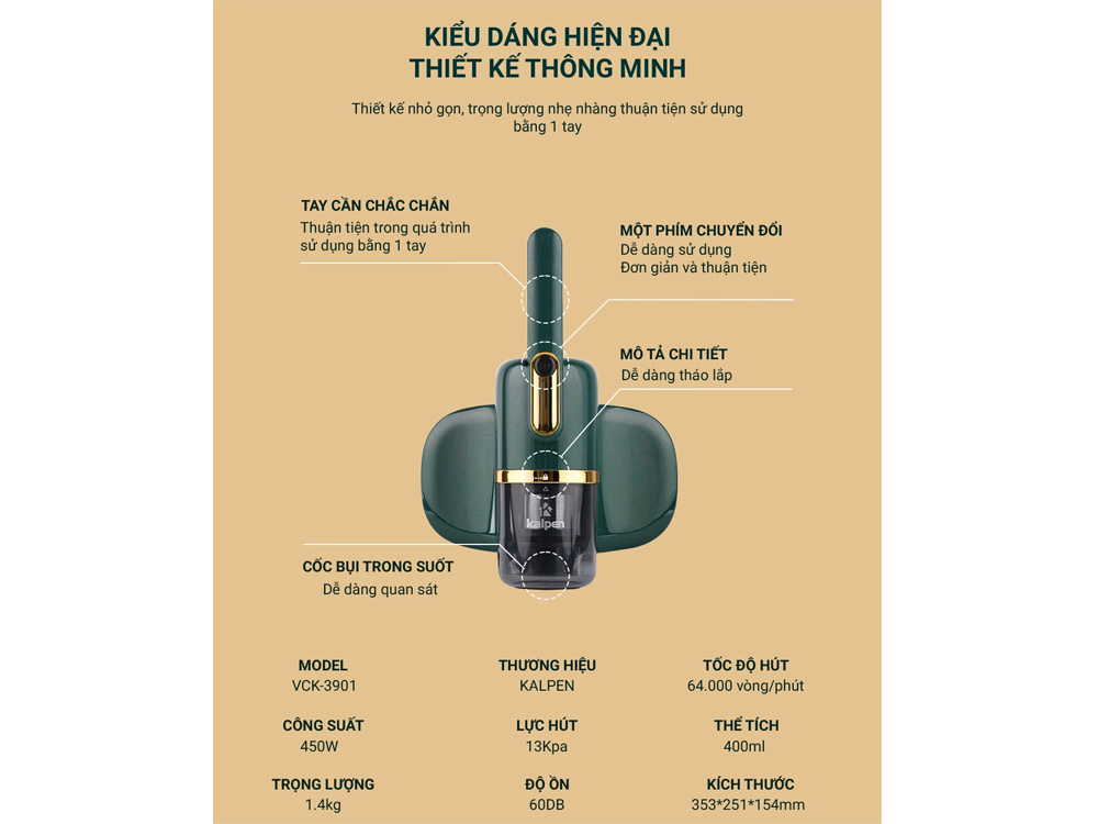 Kalpen VCK-3901 sở hữu lực hút lên đến 13KPa nhanh chóng loại bỏ mọi loại bụi bẩn như lông động vật, tóc, vi khuẩn....