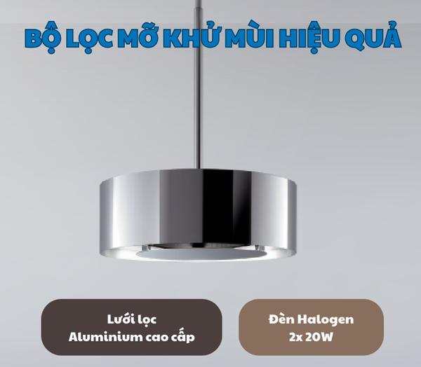 Lưới lọc hợp kim nhôm có tác dụng ngăn chặn dầu mỡ, bụi bẩn xâm nhập vào bên trong máy, giúp bảo vệ động cơ và đảm bảo hiệu quả hoạt động lâu dài. Hệ thống đèn Halogen 2 x 20W cung cấp ánh sáng trắng, giúp bạn dễ dàng quan sát khu vực nấu nướng.