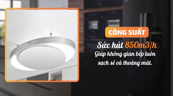 Với công suất hút lên đến 850m3/h, đảm bảo hiệu quả loại bỏ mùi thức ăn, hơi ẩm và khói bụi. Đặc biệt, độ ồn khi hoạt động chỉ 58 dB, đem lại sự yên tĩnh và thoải mái cho gia đình bạn.
