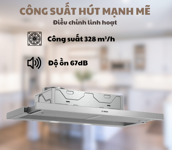 Máy hút mùi âm tủ Bosch DFM094W53 Series 4 có khả năng hoạt động với công suất tối đa lên tới 108W, tạo công suất hút mạnh mẽ 383m3/h, giúp loại bỏ nhanh chóng mùi thức ăn, khói và hơi dầu mỡ, giữ cho không gian bếp luôn thông thoáng. Ngoài ra, máy còn được trang bị 3 mức công suất hút linh hoạt, cho phép bạn điều chỉnh phù hợp với từng nhu cầu nấu nướng. Điều này giúp hút mùi hiệu quả mà vẫn đảm bảo tiết kiệm điện năng tối ưu.