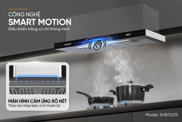 Máy hút mùi SUNHOUSE SHB72015 ứng dụng công nghệ cảm biến cử chỉ thông minh Smart Motion, mang đến trải nghiệm điều khiển hoàn toàn không chạm. Chỉ với thao tác cái vẫy tay, người dùng có thể dễ dàng bật/tắt máy hoặc điều chỉnh tốc độ hút theo nhu cầu. Tính năng này không chỉ đảm bảo bề mặt máy luôn sạch sẽ, giảm thiểu tiếp xúc trực tiếp để hạn chế vi khuẩn, mà còn tiện lợi khi bận rộn nấu nướng.