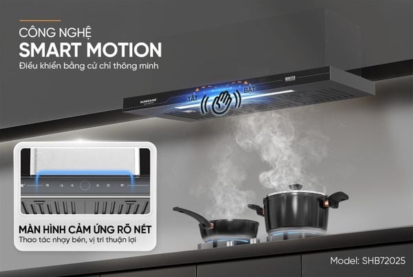 Máy hút mùi SUNHOUSE SHB72025 ứng dụng công nghệ cảm biến cử chỉ thông minh Smart Motion, mang đến trải nghiệm điều khiển hoàn toàn không chạm. Chỉ với thao tác cái vẫy tay, người dùng có thể dễ dàng bật/tắt máy hoặc điều chỉnh tốc độ hút theo nhu cầu. Tính năng này không chỉ đảm bảo bề mặt máy luôn sạch sẽ, giảm thiểu tiếp xúc trực tiếp để hạn chế vi khuẩn, mà còn tiện lợi khi bận rộn nấu nướng.Bảng điều khiển cảm ứng cùng màn hình hiển thị rõ nét, được đặt ở vị trí dễ dàng quan sát, cho phép thao tác nhanh chóng mà không cần phải cúi xuống hay di chuyển nhiều. Các thông số hiển thị trực quan, giúp người dùng điều chỉnh các chức năng của máy một cách chính xác và hiệu quả.