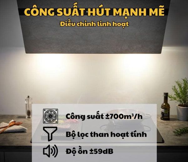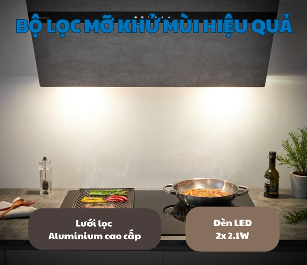 Sản phẩm sử dụng lưới lọc nhôm và hệ thống khử mùi bằng than hoạt tính và ống thoát Ø150, giúp loại bỏ mùi và khói hiệu quả, đảm bảo không gian nhà bếp luôn sạch sẽ và thoáng mát.