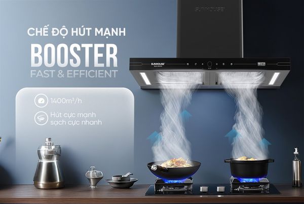 Máy hút mùi SUNHOUSE SHB72093 được trang bị chế độ Booster hút mạnh tiện dụng, cho phép máy tăng công suất hút lên mức tối đa 1400m3/h trong thời gian ngắn. Động cơ tua-bin với lực hút lớn và thiết kế cánh quạt tối ưu giúp tăng hiệu quả lọc khí, loại bỏ nhanh chóng mùi từ các món chiên xào, nướng hay khi có mùi cháy khét hoặc khói lan nhanh, Đặc biệt, chất liệu và khả năng tản nhiệt tốt giúp động cơ hoạt động bền bỉ, cho lực hút mạnh đều và ổn định. Nhờ khả năng vận hành linh hoạt, máy không chỉ loại bỏ mùi nhanh chóng mà còn hạn chế tối đa sự lan tỏa của mùi khó chịu sang khu vực xung quanh, để không gian sống luôn sạch sẽ và thoải mái.