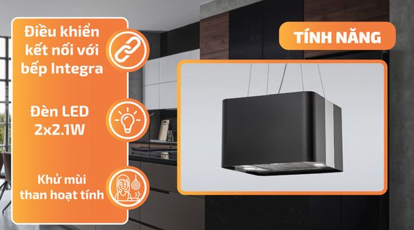 Máy tích hợp hệ thống điều khiển kết nối với bếp Integra, cho phép đồng bộ hóa hoạt động giữa bếp và máy hút mùi một cách thông minh. Người dùng có thể điều chỉnh 4 tốc độ hút linh hoạt thông qua remote tiện lợi, phù hợp với mọi nhu cầu nấu nướng – từ hấp nhẹ đến chiên xào nhiều khói.