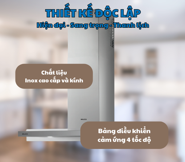 Thân máy bằng thép không rỉ, chống ăn mòn phối kính phù hợp với nhiều không gian bếp. Máy dạng tum ống khói độc lập, gắn trần nhà. Vì vậy bạn có thể linh hoạt lắp đặt ở mọi nơi mà không bị giới hạn không gian. Dễ thấy những căn bếp có không gian mở hoặc quầy bar đều sử dụng loại máy độc lập này. Với thiết kế sang trọng, tinh tế mang tới cho không gian bếp hiện đại một vẻ đẹp hoàn mĩ.