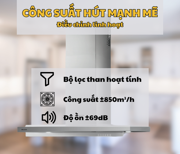 Với công suất hút 850 m3/h, sản phẩm có khả năng hút mùi và khí độc nhanh chóng, giúp không gian bếp luôn sạch sẽ và trong lành. Độ ồn dưới 69dB giúp máy hoạt động êm ái, tạo cảm giác thoải mái cho người sử dụng. Kiểu lắp âm tủ giúp tiết kiệm không gian và mang đến vẻ đẹp gọn gàng cho bếp nhà bạn.