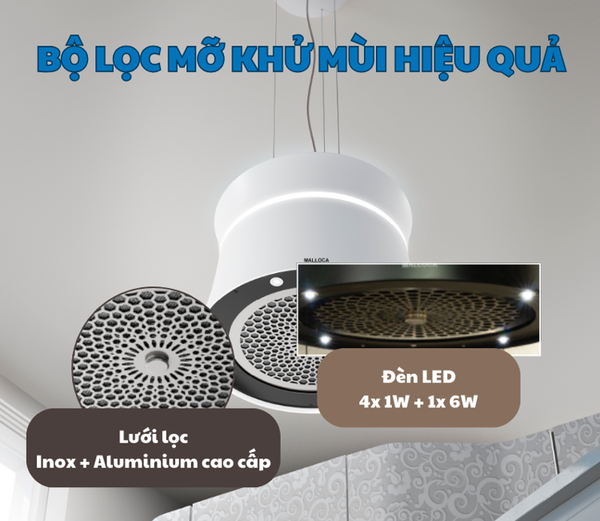 Máy hút mùi Malloca được trang bị hệ thống đèn LED vừa chiếu sáng tốt cho không gian nhà bếp, vừa có đèn trang trí đẹp mắt tăng độ sáng cho không gian bếp, mang tính thẩm mỹ cao cho khu vực nấu nướng. Chính điều này giúp bạn nấu nướng dễ dàng hơn, tạo cảm giác thư giãn vô cùng dễ chịu khi vào bếp.