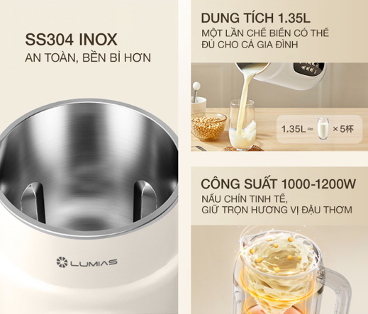Với dung tích lớn 1.35L, Lumias M135B có thể chế biến lượng sữa hạt tương đương khoảng 5 cốc 250ml trong một lần. Nhờ đó, đáp ứng nhu cầu sử dụng cho cả gia đình, từ bữa sáng dinh dưỡng cho mọi thành viên đến việc chuẩn bị đủ lượng sữa để thưởng thức trong ngày mà không cần phải xay nấu nhiều lần, mang lại sự tiện lợi tối đa.