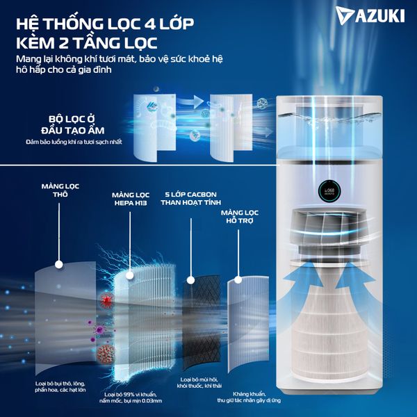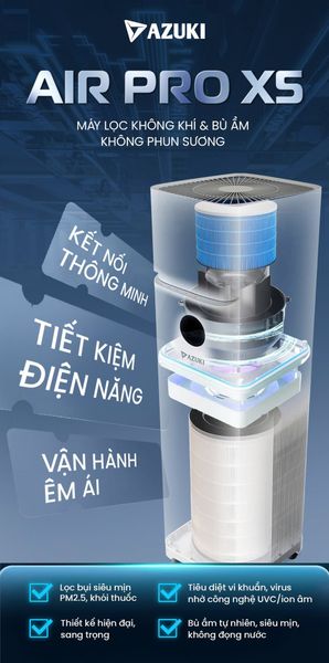AZUKI AIR PRO X5 là dòng máy lọc không khí bù ẩm không phun sương cao cấp, tích hợp công nghệ lọc đa tầng, UV-C diệt khuẩn, cùng hệ thống tạo ẩm bay hơi tự nhiên. Đây là giải pháp lý tưởng để bảo vệ sức khỏe cho gia đình bạn trước bụi mịn, virus, khí độc và khô hanh mùa lạnh – mà vẫn không gây đọng nước hay ẩm mốc.