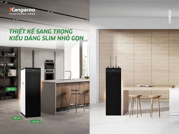 Máy lọc nước nóng lạnh Kangaroo Hydrogen Infinity KG11A2 có thiết kế tinh tế với lớp kính tràn viền ấn tượng, mang lại vẻ đẹp hiện đại và sang trọng cho không gian sử dụng. Kích thước nhỏ gọn với các chiều là 32cm x 40cm x 99cm (Rộng x sâu x cao) giúp người dùng dễ dàng bố trí trong nhiều khu vực như phòng bếp hay phòng khách, phù hợp với nhiều phong cách nội thất khác nhau.