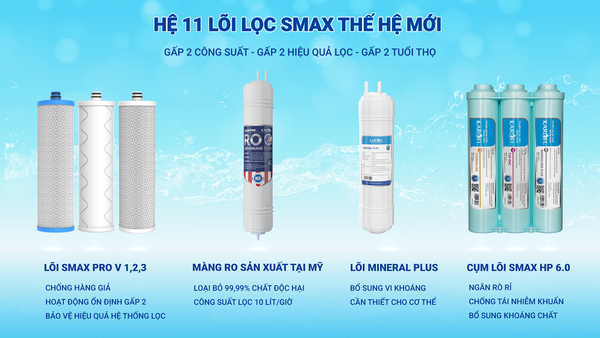 11 lõi lọc thế hệ mới công nghệ Smax giúp gấp 2 công suất, gấp 2 tuổi thọ, đồng thời tăng cường hydrogen chống lại quá trình oxy hóa, tăng cường sống khỏe mỗi ngày.