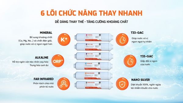 Karofi Livotec 629 sở hữu 6 lõi chức năng thay nhanh: 2 lõi Mineral, Alkaline, Far Infrared, T33, Nano Silver; giúp tăng gấp đôi hàm lượng vi khoáng có lợi cho cơ thể, chống tái nhiễm khuẩn nước và ổn định vị ngon ngọt tự nhiên.