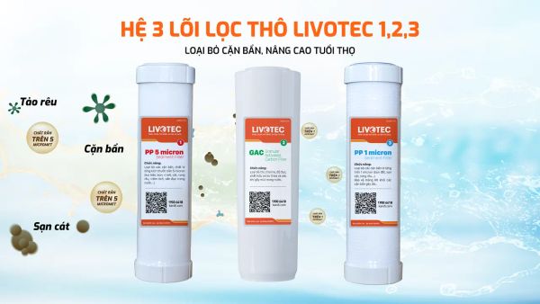 Hệ lõi lọc thô Livotec 1,2,3 loại bỏ cặn bẩn có trong nước có kích thước trên 1 micron, khử hoàn toàn mùi khó chịu, chất hữu cơ... bảo vệ hệ lõi lọc hiệu quả, nâng cao tuổi thọ sử dụng.