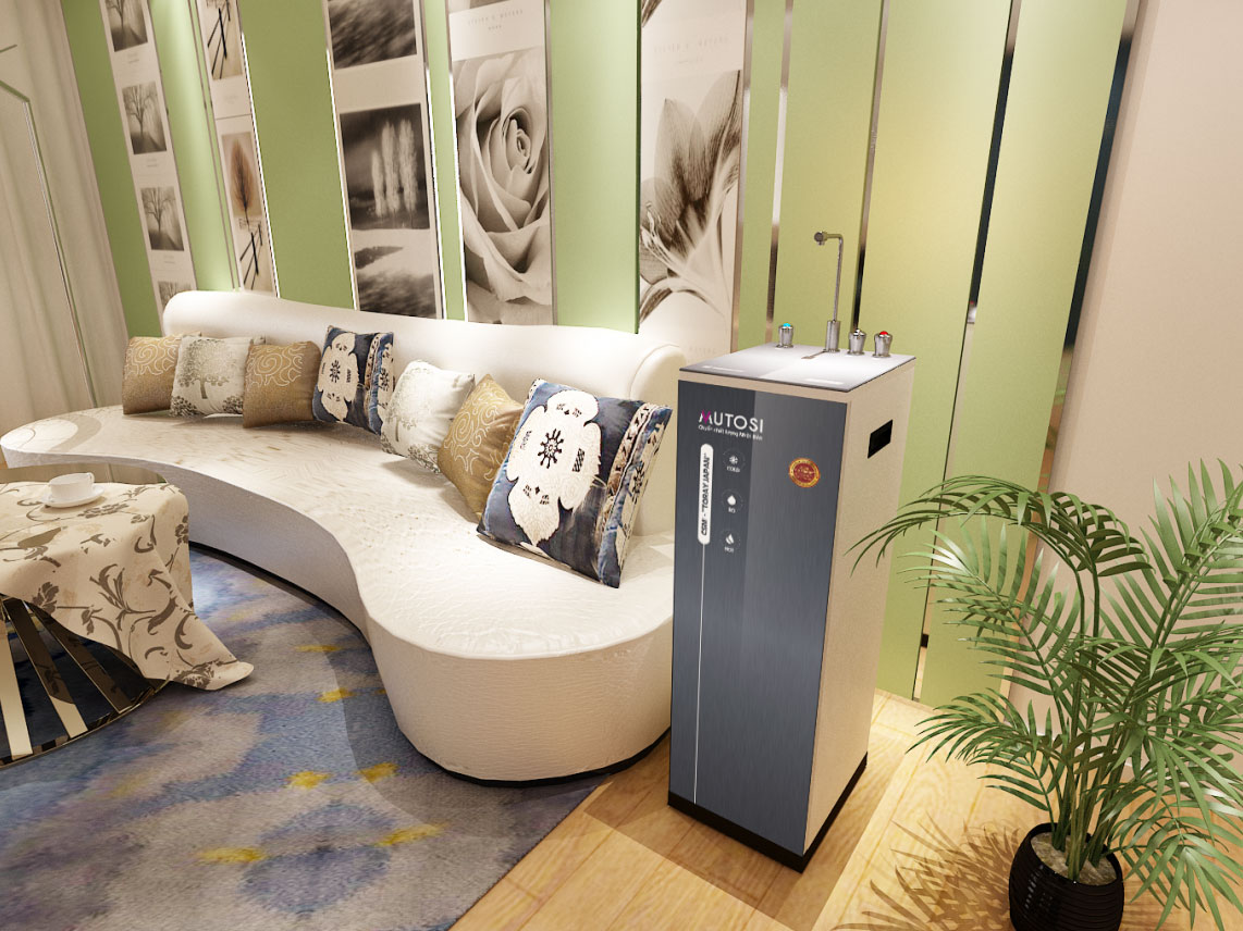 Máy lọc nước được lắp vào tủ đứng sang trọng, mặt kính cường lực đẹp mắt phù hợp với nội thất không gian trong nhà.
