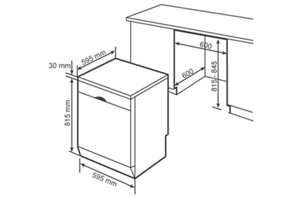 - Kích thước tiêu chuẩn: 845 x 600 x 600 mm, dễ dàng lắp đặt độc lập hoặc âm tủ.