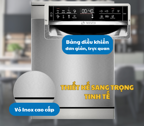 Máy rửa bát Bosch có kiểu dáng độc lập, dễ dàng lắp đặt tại nhiều vị trí trong căn bếp. Bề mặt thép không gỉ cao cấp giúp chống bám vân tay, tăng tính thẩm mỹ.