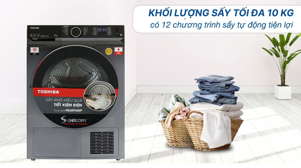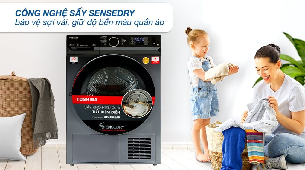 - Công nghệ sấy SenseDry: Máy sấy quần áo Toshiba trang bị cảm biến nhiệt độ và độ ẩm tự động điều chỉnh thời gian sấy phù hợp, không sấy khô quần áo quá mức, bảo vệ sợi vải, độ bền màu của trang phục.