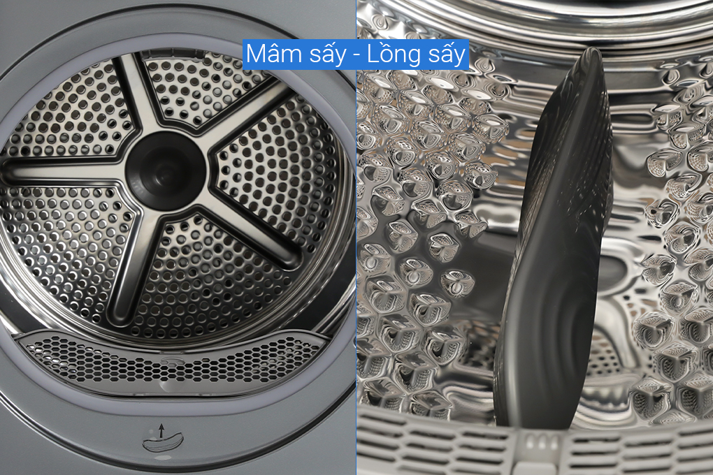 - Lồng sấy bằng thép không gỉ có độ bền cao, hạn chế ăn mòn, biến dạng trong quá trình sử dụng, đồng thời chất liệu này còn hạn chế mảng bám, bụi bẩn nên giúp vệ sinh dễ dàng.