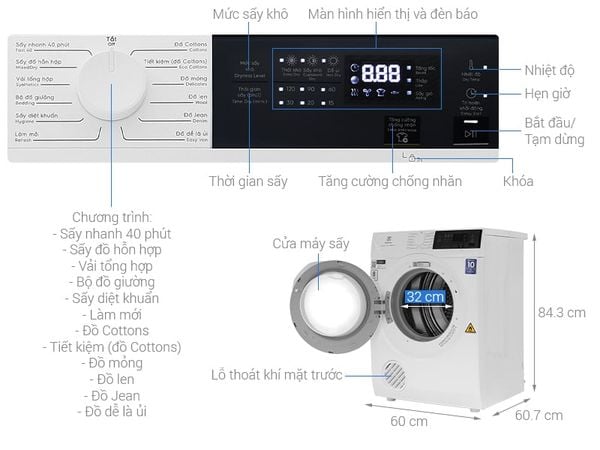 - Máy sấy sử dụng cơ chế sấy thông hơi giúp quần áo khô nhanh chóng, tiết kiệm thời gian. Người dùng nên lắp đặt máy ở không gian thoáng để luồng khí nóng ẩm có thể thoát ra ngoài dễ dàng.