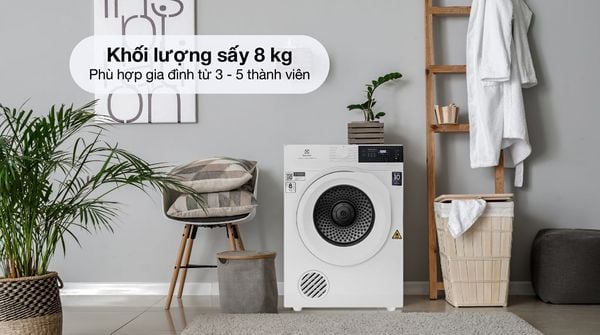 - Với khối lượng sấy 8 kg, máy phù hợp với gia đình có từ 3 đến 5 thành viên, đáp ứng nhu cầu giặt giũ hàng ngày.