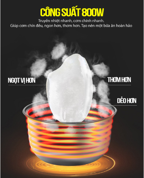 Nồi cơm điện tích hợp cơ chế gia nhiệt 2D, nhiệt tỏa từ 2 phía ở đáy và quanh thành nồi cùng công suất nấu 650W giúp nấu cơm chín nhanh trong 30 phút, nhiệt tỏa đều, cơm chín mềm, thơm ngon. Nồi thích hợp sử dụng để nấu cơm, nấu cháo, nấu xôi…