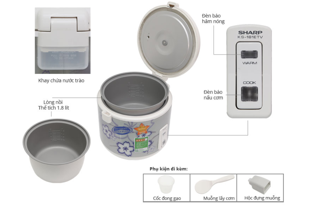 Nồi cơm điện KS-N182ETV "SW" có dung tích 1.8 lít đáp ứng nhu cầu của nhiều người tiêu dùng, phù hợp cho các bữa ăn gia đình hàng ngày có từ 4 – 6 thành viên.