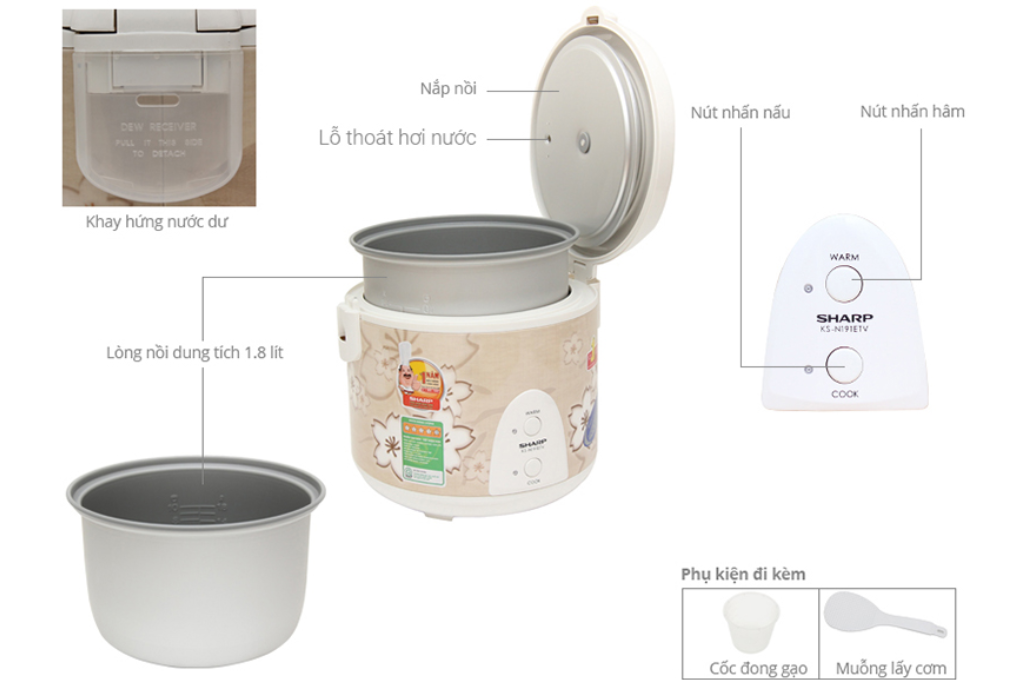 Dễ dàng sử dụngNồi cơm điện KS-N191ETV "SB" có chế độ nấu (Cook) và chế độ giữ ấm (Warm). Bảng điều khiển được thiết kế đơn giản, dễ hiểu giúp người dùng có thể sử dụng một cách dễ dàng. Vệ sinh dễ dàng, nhanh chóngLòng nồi và khay hứng nước thừa dễ dàng tháo rời để vệ sinh và làm sạch nhanh chóng, từ đó người dùng có thể tiết kiệm được nhiều thời gian và công sức để chăm lo cho gia đình và bản thân nhiều hơn.