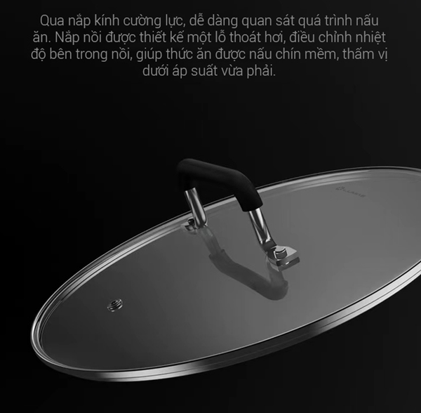 Nồi bếp từ Lumias LMP-002CM được trang bị nắp nồi cao cấp, đem đến giải pháp thông minh cho quá trình nấu nướng diễn ra thuận tiện hơn. Lớp kính cường lực dày, chịu nhiệt tốt, giúp bạn an tâm quan sát thức ăn mà không lo bị bỏng. Lỗ thoát hơi của nồi hợp kim nhôm LMP-002CM Lumias được thiết kế khoa học, giúp cân bằng áp suất bên trong nồi, từ đó rút ngắn thời gian nấu, đảm bảo món ăn luôn được nấu chín đều, giữ trọn hương vị thơm ngon. Đây là thiết kế đặc biệt hữu ích cho những món hầm, kho cần thời gian chế biến lâu.
