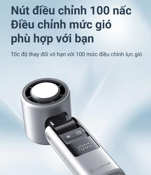 Quạt cầm tay Lumias F4000 nhỏ gọn, 100 tốc độ gió, pin 4000mAh, sạc nhanh Type-C và tính năng chườm lạnh tức thì. Thiết kế hiện đại, tay cầm gập linh hoạt – tiện lợi mọi nơi, mát lạnh suốt cả ngày.