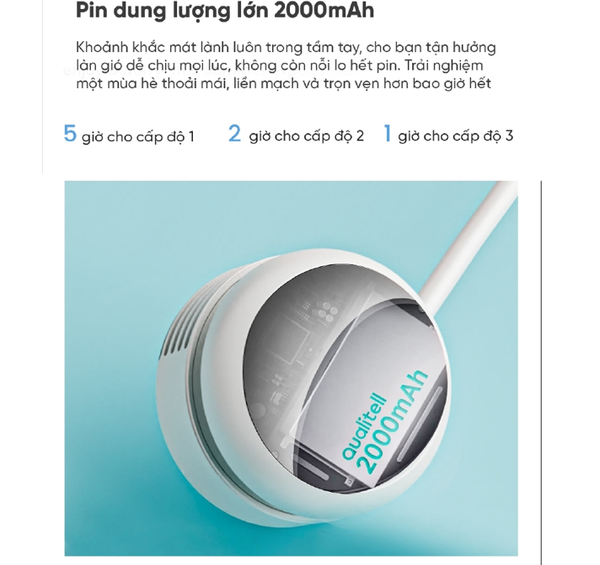 Với viên pin 2000mAh, quạt hoạt động bền bỉ từ 1 đến 5 giờ, tùy cấp độ gió: